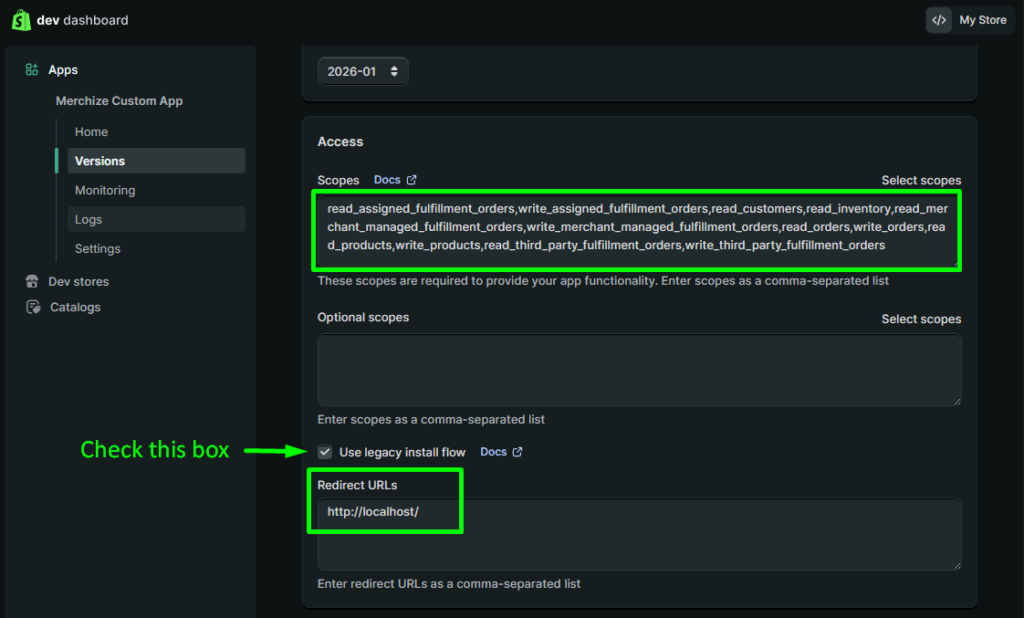 read_assigned_fulfillment_orders,write_assigned_fulfillment_orders,read_customers,read_inventory,read_merchant_managed_fulfillment_orders,write_merchant_managed_fulfillment_orders,read_orders,write_orders,read_products,write_products,read_third_party_fulfillment_orders,write_third_party_fulfillment_orders- Use legacy install flow: Check this box (Set to True)