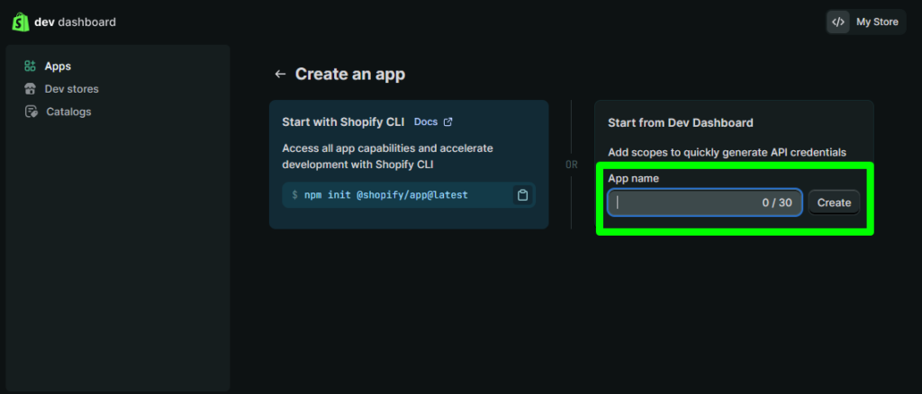 2. Click Create app and select Start from Developer Dashboard.