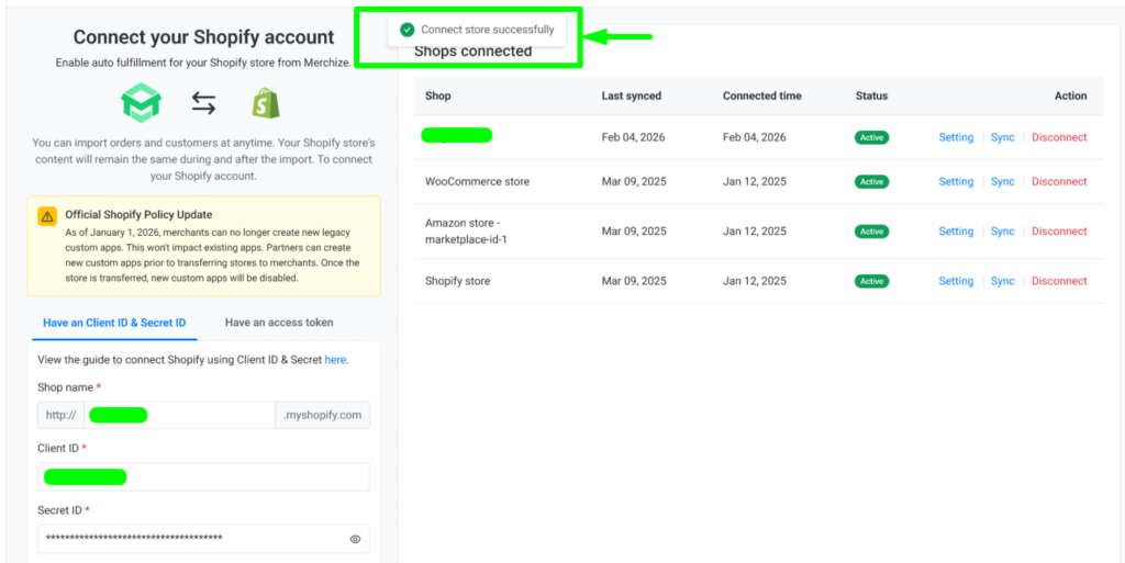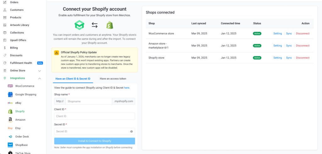 - Mandatory for New Sellers: If you registered your Shopify seller account from January 2026 onwards, you must use the Client ID and Client Secret method to connect to Merchize.