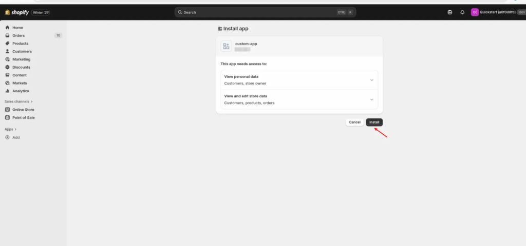 A new tab will open, directing you to Shopify to authorize the installation. Click Install to confirm.